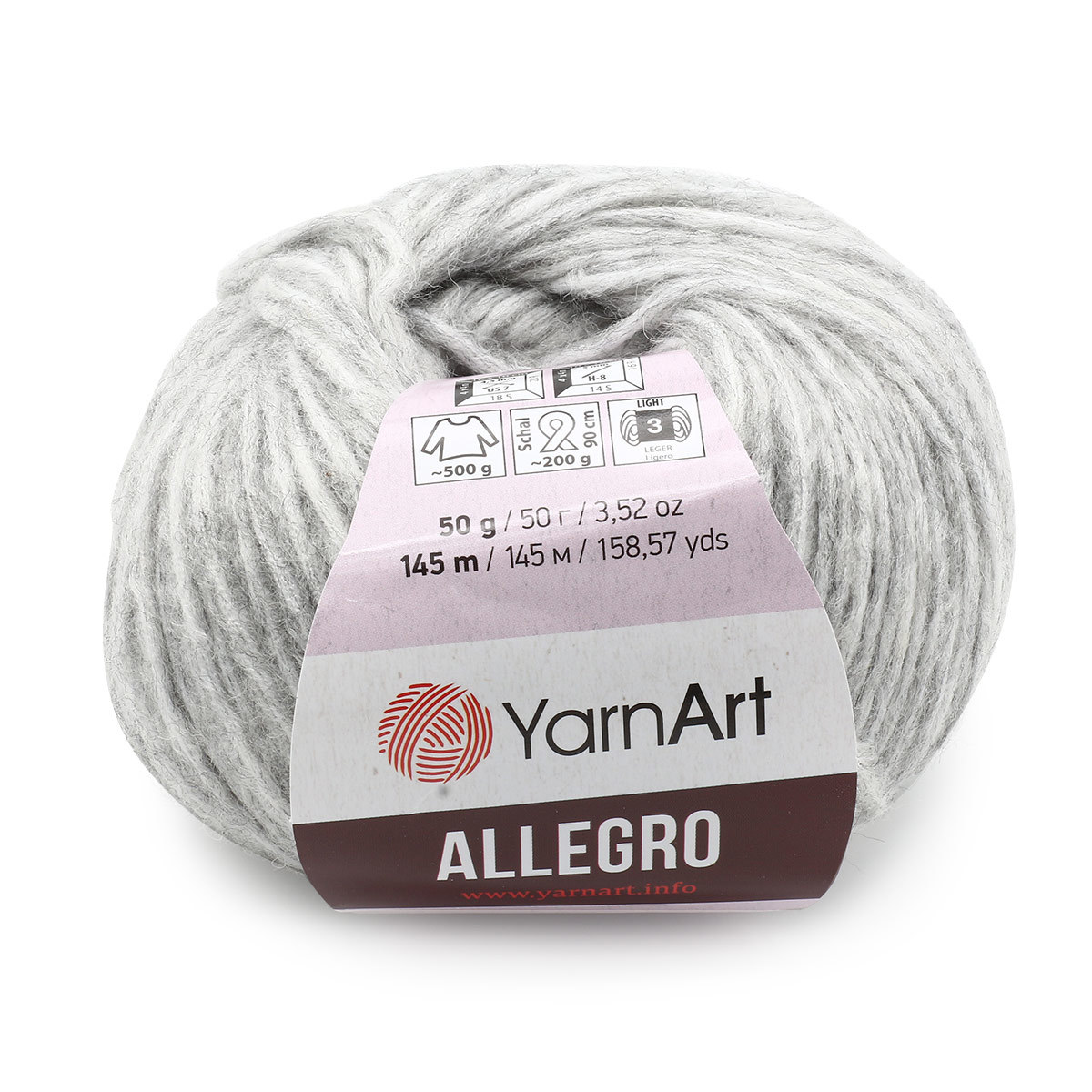 "Allegro" – достаточно толстая пряжа в виде плетеного шнура, продается небольшими мотками по 50 г. Благодаря добавлению полиамида вещи из этой пряжи хорошо сохраняют форму, устойчивы к стиркам и обычному ношению. Акрил – мягкий материал, изделия с большим содержанием акрила не вызывают аллергии, комфортны к телу. Благодаря добавлению шерстяных волокон вещи из пряжи "Allegro" обладают согревающим эффектом.