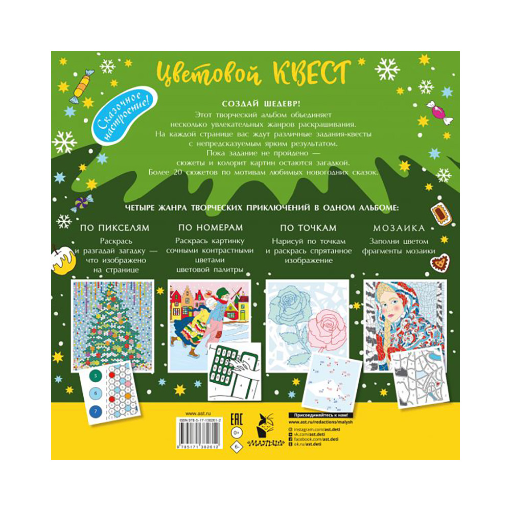 Этот творческий альбом объединяет несколько увлекательных жанров раскрашивания. На каждой странице вас ждут различные задания-квесты с непредсказуемым ярким результатом. Пока задание не пройдено — сюжеты и колорит картин остаются загадкой. Более 20 сюжетов по мотивам любимых новогодних сказок.