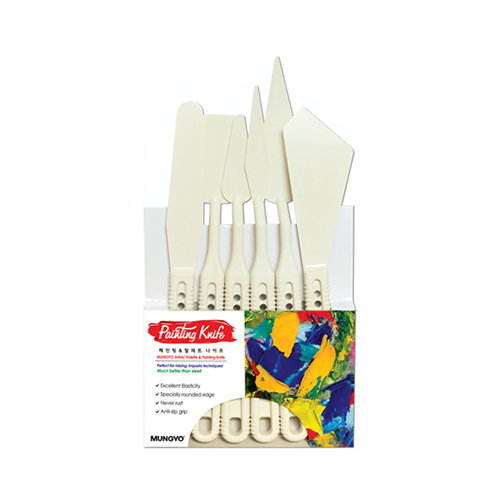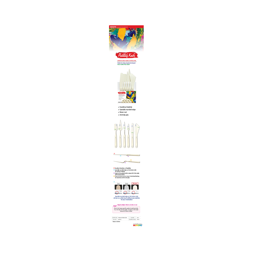 Набор мастихинов MPPK6 - Идеально подходит для смешивания в технике импасто! - Отличная эластичность и гибкость - Специально закругленный край - Противоскользящее сцепление - Специально закругленный край с нижней стороны придаст вашему шедевру более мягкое прикосновение без каких-либо царапин - кончик мастихина приподнимается со стола при опускании - легко моется - никогда не коррозирует и не ржавеет - из-за большого удельного веса мастихина, его можно окунуть в воду, чтобы через некоторое время краска легко смывалась - эргономичный бесшовный дизайн - противоскользящая отделка для максимального комфорта и сцепления