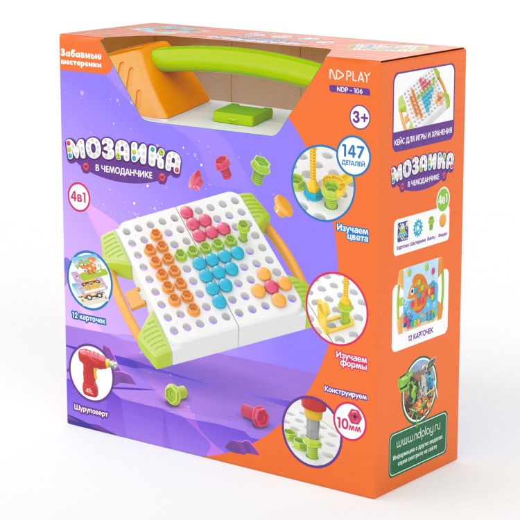 Развивающий детский конструктор 3D с дрелью 2-х режимов и 135 ярких деталей с болтами в чемодане + 12 карточек! Новинка. Новые детали, крупная мозаика. На рабочую поверхность закрепляем карточки и ребенок уже может легко раскрашивать картинки мозаикой разного цыета и размера или вкручивать болтики и детали. В набор входят: коробочка для хранения конструктора , 135 деталей, удобный шуруповёрт с 3 разными насадками, мозаика, отвёртка и гаечный ключ. А для родителей самое главное то, что конструктор развивает: мелкую моторику рук, координацию движений, внимание, мышление, память, восприятие цвета и формы, навыки конструирования, художественное воображение и творческие навыки. Дрель оценят не только мальчики, но и девочки! Им будет интересно собрать цветочную поляну или разноцветных. Вариантов очень много, главное включить фантазию.