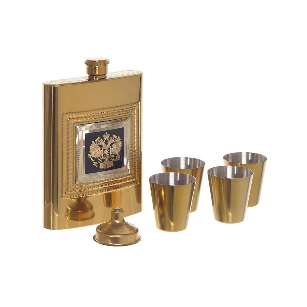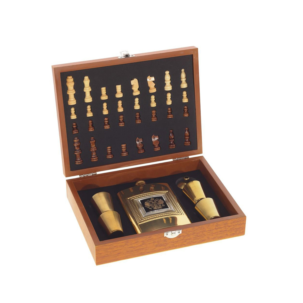 Этот набор станет прекрасным подарком. В него входит шахматная доска с фигурами, воронка, 4 стопки, фляжка из коррозионностойкой стали, украшенная гербом РФ. Набор можно использовать как по отдельности, так и в комплекте с другими предметами.