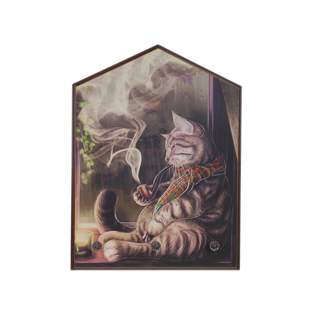Ключница в форме домика открытого типа с тремя крючками. Украшена веселым изображением кота с трубкой . Ключница – предмет не только красивый, но и функциональный, поэтому ей найдется место и в квартире, и в загородном доме.