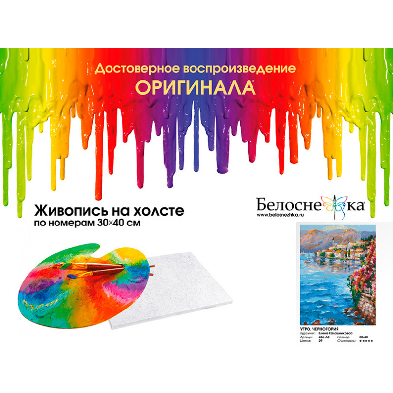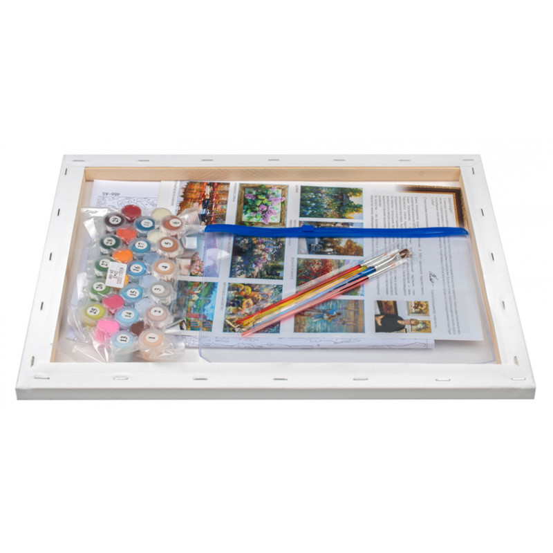 Комплектация: Холст на подрамнике с пронумерованной схемой Контрольный лист Набор акриловых красок Кисти – 4 шт. Крепление для готовой картины Пакет с zip-застежкой 23 х 17,5 см Листовка о художнике