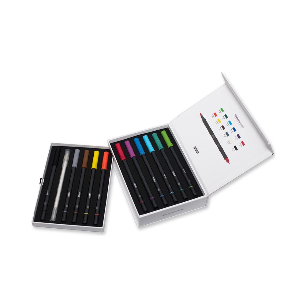 Набор состоит из 12 двусторонних кистей/маркеров, предназначенных для творчества и офисного применения. Маркеры выполнены в форме бамбукового стебля. Толщина линии 0,4 и 3 мм. Упакован в подарочную двухъярусную выдвижную коробку из плотного ламинированного картона с тиснением, закрывается на магнитный замок.