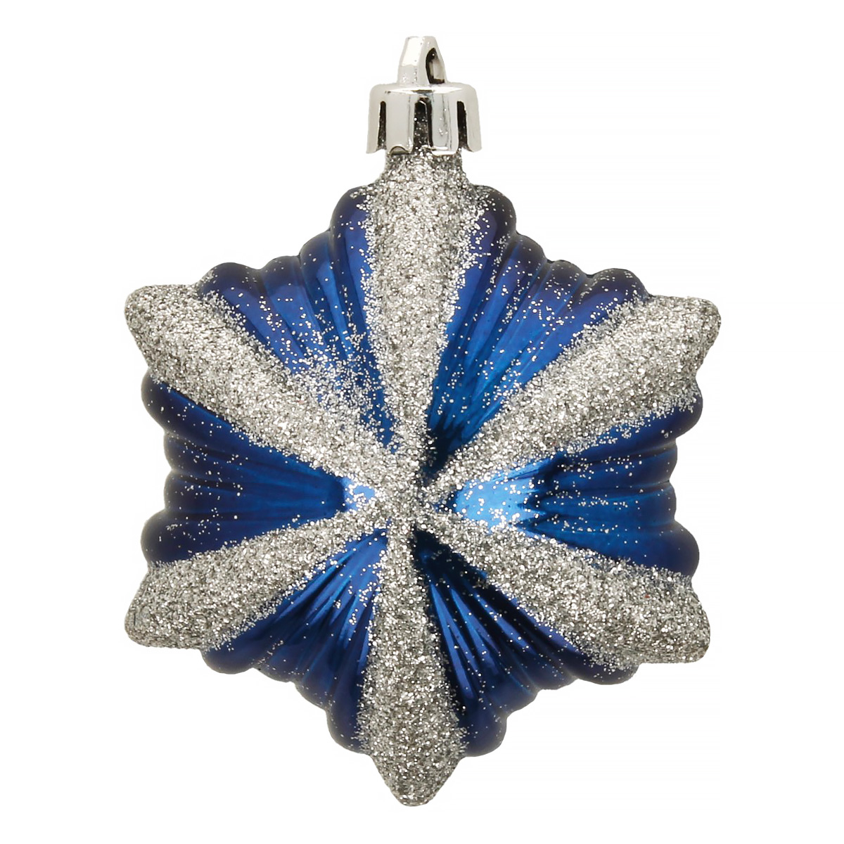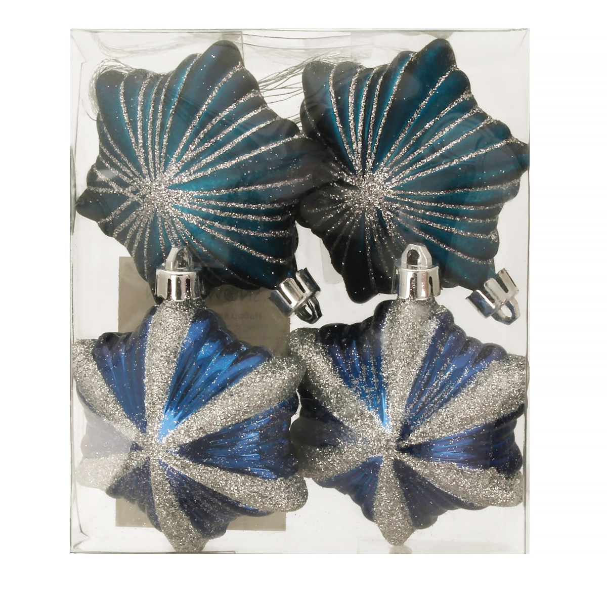 Набор из четырех ёлочных игрушек в виде звёзд, усыпанных ослепительными блёстками, добавит атмосферу праздника в вашем доме. Игрушки выполненные из полистирола, размер игрушки - 8 см. В наборе 2 полуночно-синих и 2 звезды цвета индиго, с блестящими лучами. Упакованы в прозрачную пластиковую коробочку. Есть нити для подвешивания.