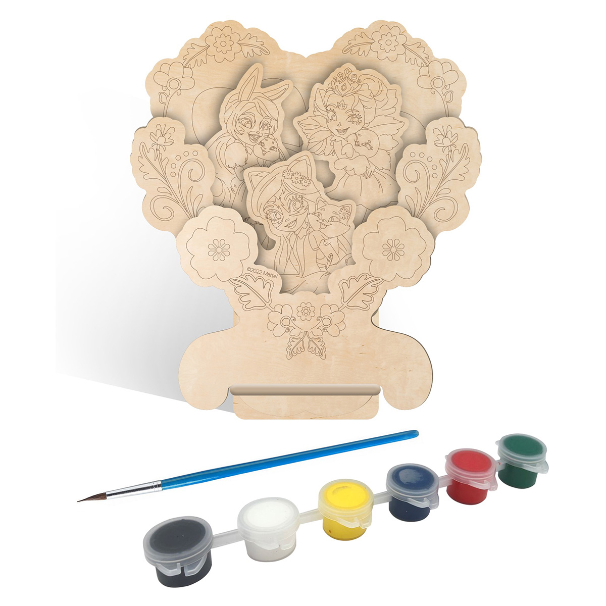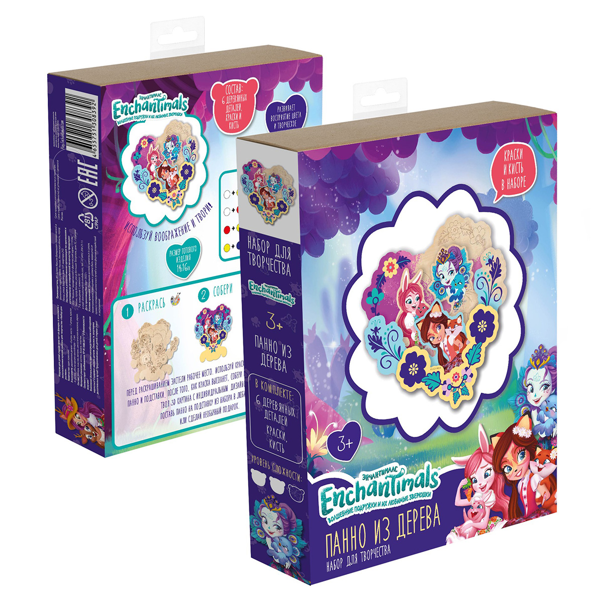 Набор для творчества "3D панно из дерева Волшебные подружки Enchantimals" для раскрашивания. В комплекте: 4 фигурных слоя из фанеры с нанесением контурного рисунка + 2 детали для создания подставки, краски акрил 6 цветов, кисть. Создание панно развивает творческие способности ребенка, эстетическое восприятие, мелкую моторику. Предназначен для детей от 3 лет.