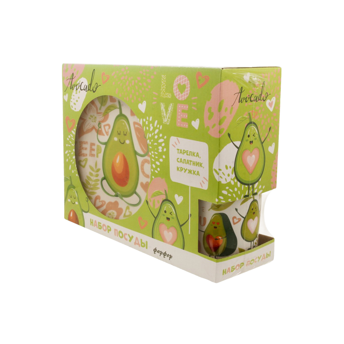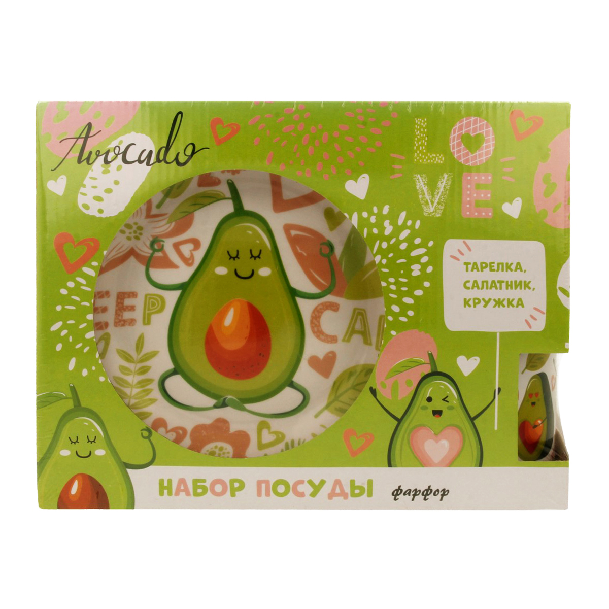 Набор посуды «Авокадо. Keep Calm» ? эффектный подарок для детей и взрослых! Набор посуды изготовлен из фарфора, состоит из 3-х предметов: тарелки диаметром 18,5 см, салатника диаметром 17 см и кружки 220 мл. Отличается оригинальным дизайном с изображением авокадо. Посуду из фарфора можно использовать для горячих и холодных блюд, мыть в посудомоечной машине и нагревать в СВЧ-печи. Не рекомендуем мыть посуду абразивными моющими средствами и хранить под прямыми солнечными лучами, чтобы рисунок дольше оставался ярким. Подарочная коробка подчеркнет уникальность посуды и выделит ее среди других наборов в магазине.