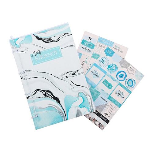 В набор входит: две картонные обложки, листы для записи, шнур, наклейки для декора. У обложек и листов перфорация на четыре отверстия.