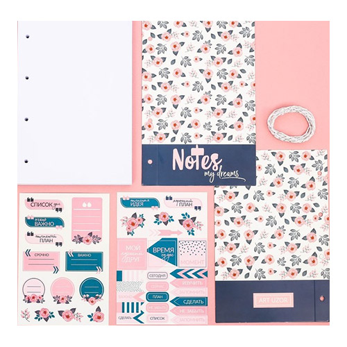 В набор входит: две картонные обложки, листы для записи, шнур, наклейки для декора. У обложек и листов перфорация на четыре отверстия.