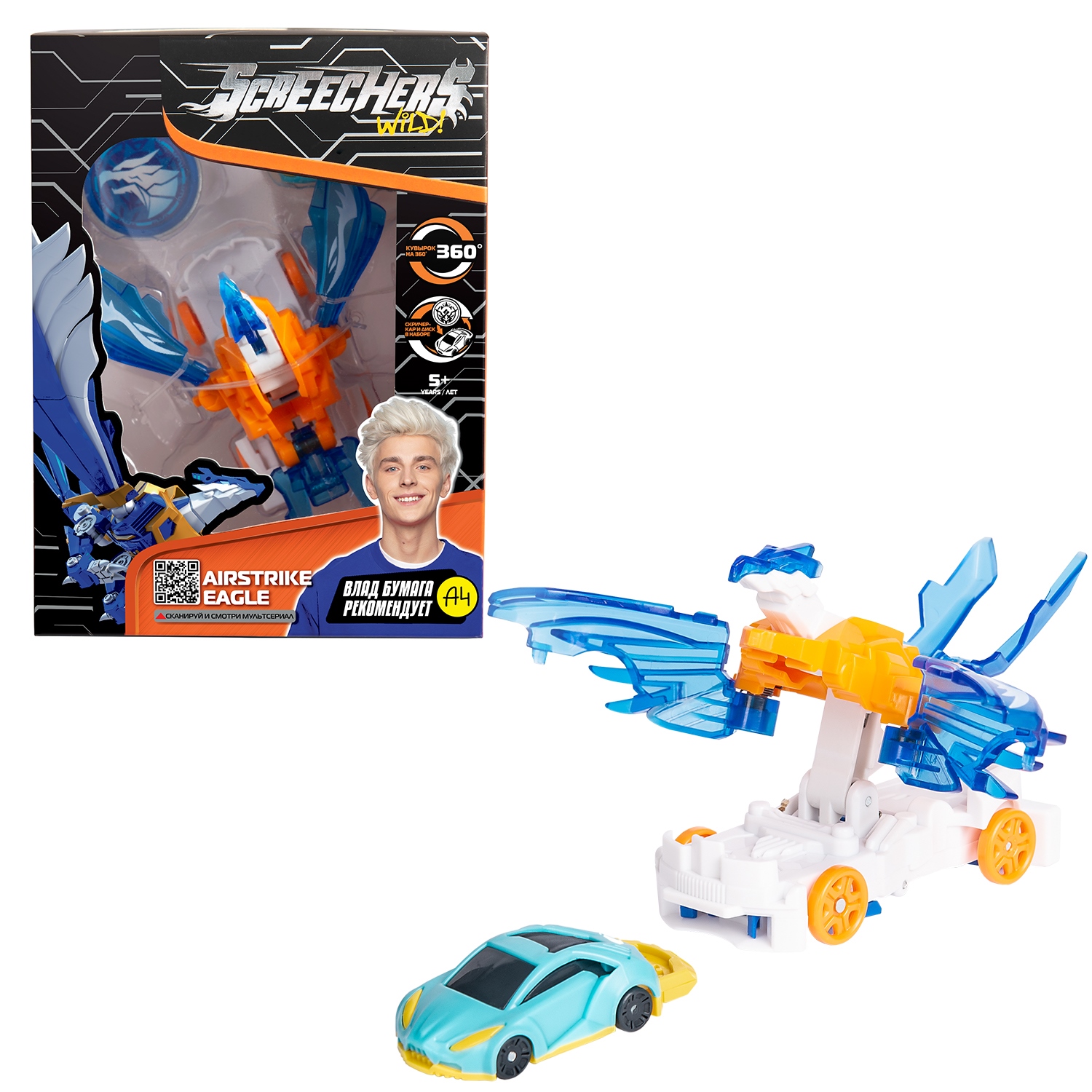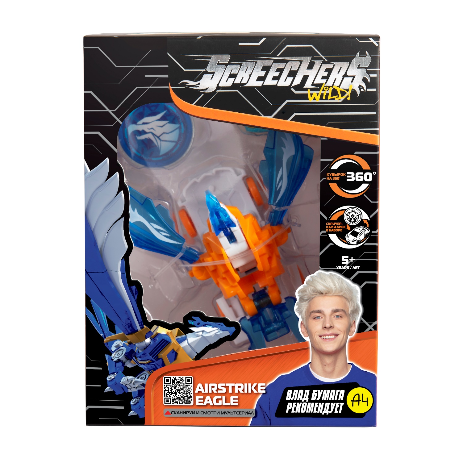 Скричер LEVEL 1 трансформируется, совершая кувырок на 360°. Дополнительный элемент трансформации в наборе! Теперь можно выбирать сценарий баттла: усиленный скричер-диск 4 сезона для запуска вперед или скричер-кар для продолжения в гонке. Дикий Скричер Level 1 разгоняется, делает кувырок на 360° и запускает скричер-диск или скричер-кар вперёд, самостоятельно трансформируясь прямо в воздухе. Обратно в машинку игрушка собирается вручную. Несколько движений - и она готова к новому кувырку. Машинка-трансформер " Эйрстрайк Игл " превращается в штормового орла! Устрой баттл – стань крутым скричером! В набор входит машинка-трансформер [14х8х11 см], энергетический диск, скричер-кар, коллекционная карточка. Игрушка упакована в коробку с окном [14х18х10 см]. Играть со скричером можно где угодно, никаких дополнительных приспособлений не требуется. Машинка-трансформер выполнена из высококачественного материала, товар сертифицирован. Эксклюзивный дистрибьютор бренда "Дикие Скричеры" на территории РФ - компания "РОСМЭН".
