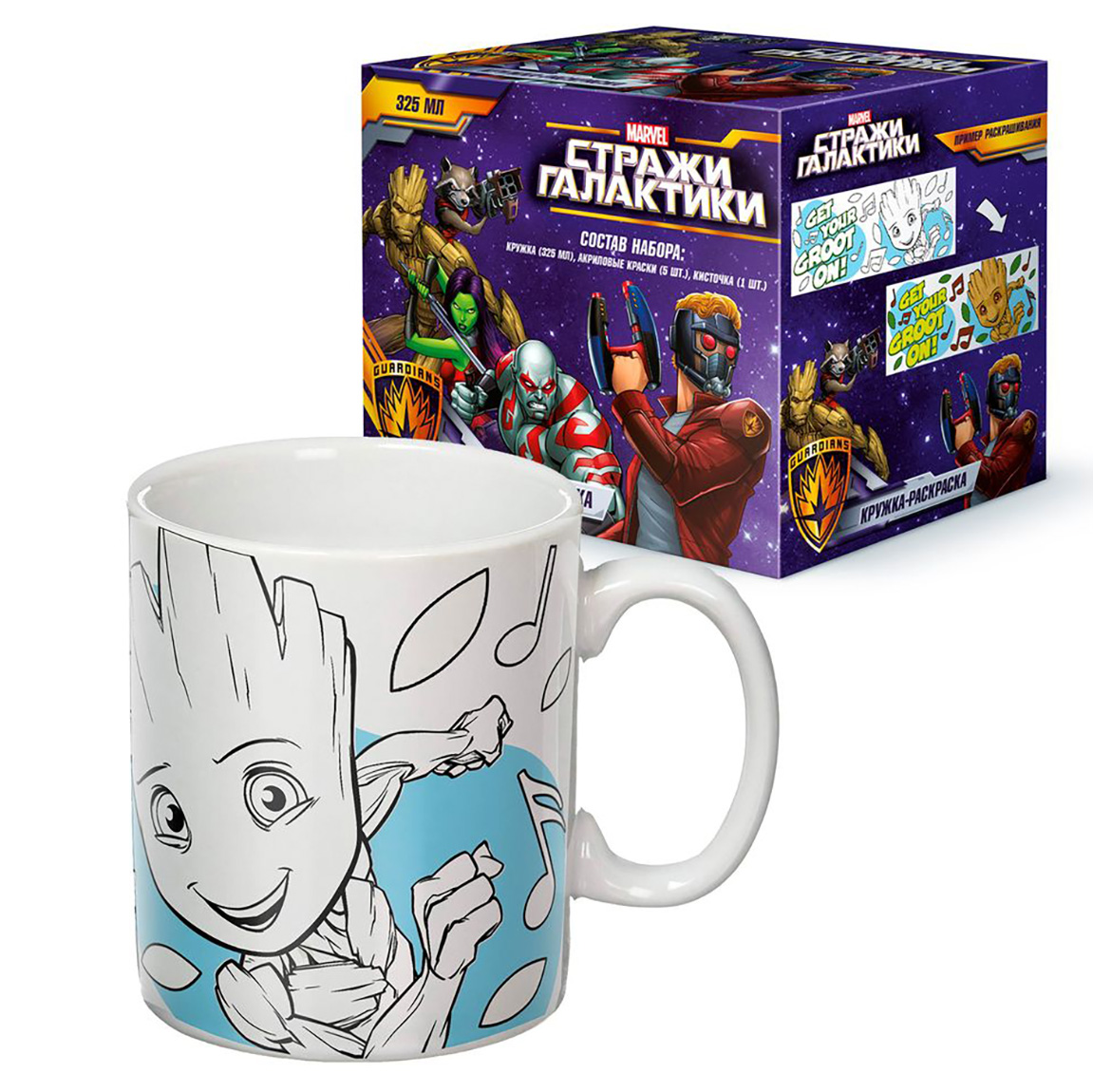 Оригинальная кружка-раскраска «Стражи Галактики» удивит и заинтересует поклонников популярного фильма! Керамическая кружка объемом 325 мл упакована в индивидуальную коробку с подробной инструкцией и примером для раскрашивания. Детскую кружку без нанесенных красок можно использовать как посуду для горячих и холодных напитков. Керамическая посуда с удобной ручкой отлично сохраняет тепло и при этом не обжигает руки при нагревании. Раскрашенная кружка используется как сувенир или функциональная деталь интерьера: подставку для карандашей и кисточек, украшение для детской тумбочки, емкость для хранения маленьких игрушек и аксессуаров. Вместе с кружкой-раскраской в набор входит комплект акриловых красок 5 шт. и кисточка. Наносить краски на кружку можно несколько раз.