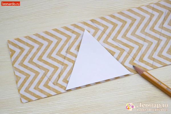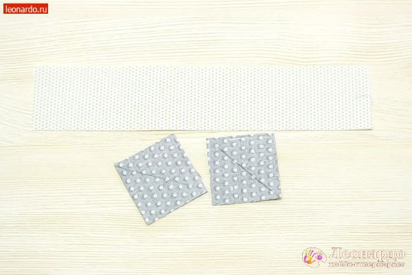 8. На двух маленьких квадратах размером 1,5 " из коричневой ткани в белый горох с изнаночной стороны наметим диагональные линии.