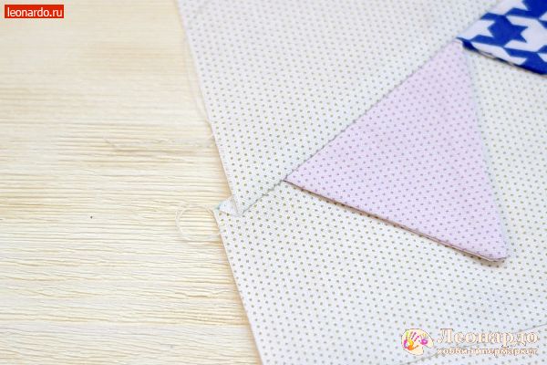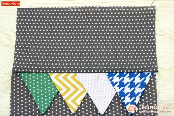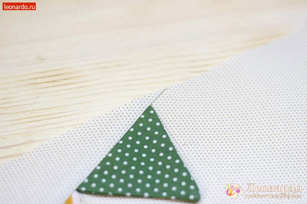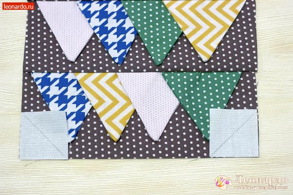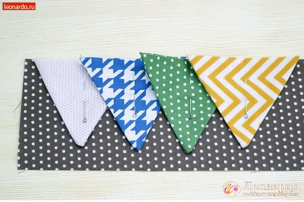 5. Булавками отметим середину каждого треугольника. На полосу из коричневой ткани в белый горох (размером 3 х 7,5 ") выложим ряд из четырех разноцветных треугольников так, чтобы открытые срезы треугольников были расположены вдоль верхнего края полосы. При этом треугольники лягут «внахлест» – чтобы левый угол верхней детали доходил до середины верхней стороны нижней детали. Приколем треугольники к полосе.