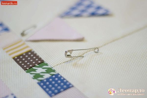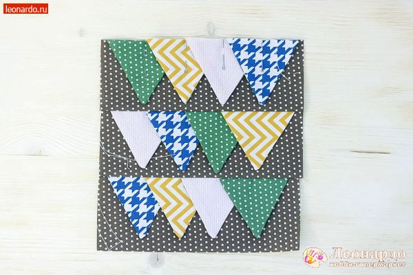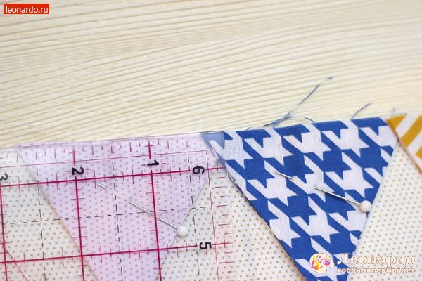 14. От левого верхнего угла центральной части одеяла отметим вправо по горизонтали 9,5 " и вниз по вертикали 4,5". Приложим линейку, совместив эти метки и отрежем угол. Срезанную деталь временно отложим, а вдоль косого среза на полотне выложим ряд из оставшихся четырех цветных треугольников. При этом треугольники должны заходить один на другой на ¼". Приколем булавками флажки к фону.