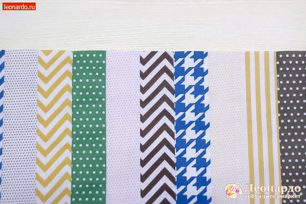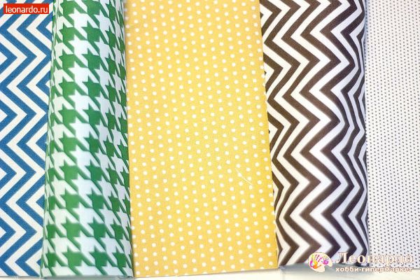 * из тканей «PEPPY», арт.: БС-23 (зеленая в белый горох), арт.: БС-30 (светлая в розовый горох), арт.: БС-14 (светлая с желтыми зигзагами), арт.: БС-31 (светлая с синими гусиными лапками):