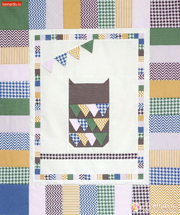 18. На схеме изображен общий вид одеяла. Сложный бордюр вокруг Совы состоит из узкого бордюра из квадратов размером 1", полосы фоновой ткани шириной 1" и широкого бордюра из прямоугольников и угловых квадратов. Узкий бордюр из дюймовых квадратов можно сшить ускоренным способом. Для этого понадобиться 15 полос шириной 1,5 " из разноцветных тканей.