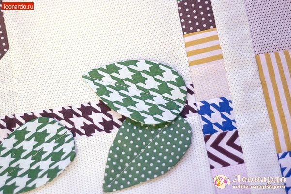 35. Пришьем листики к ветке, проложив строчку прямо посередине каждой детали. Обязательно сделаем закрепку в начале и в конце строчки.