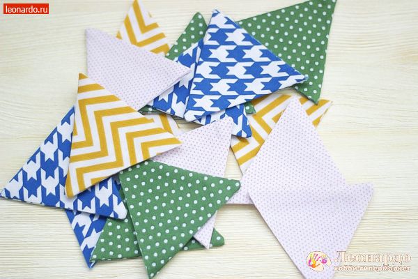 4. Подготовим 16 треугольников из разноцветных тканей. Внешние открытые срезы выровняем.