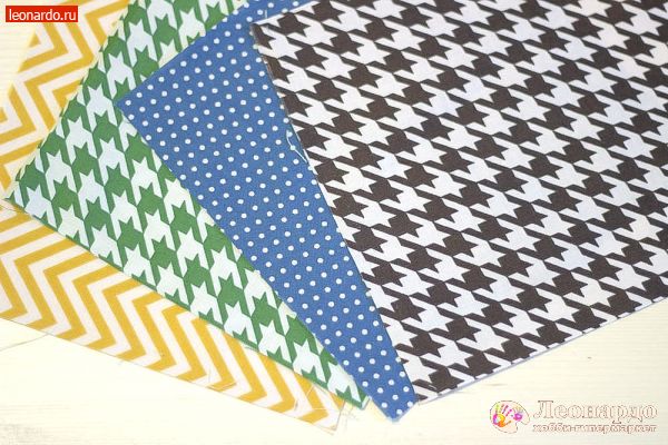 5. Булавками отметим середину каждого треугольника. На полосу из коричневой ткани в белый горох (размером 3 х 7,5 ") выложим ряд из четырех разноцветных треугольников так, чтобы открытые срезы треугольников были расположены вдоль верхнего края полосы. При этом треугольники лягут «внахлест» – чтобы левый угол верхней детали доходил до середины верхней стороны нижней детали. Приколем треугольники к полосе.