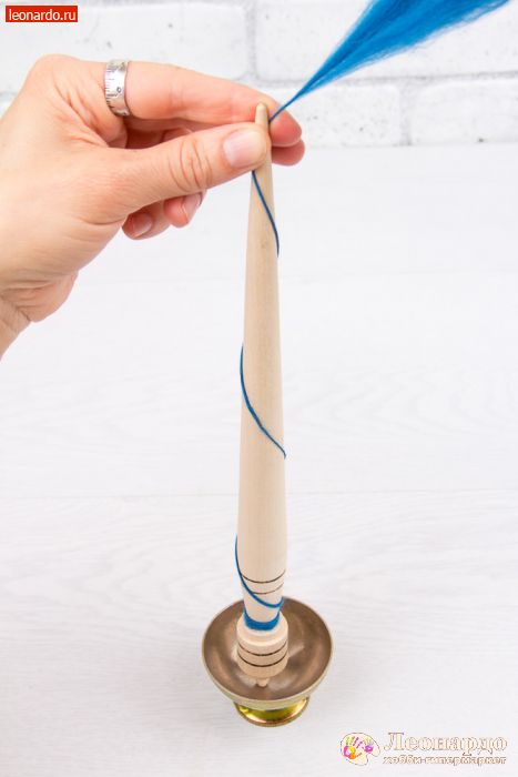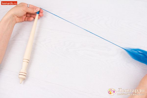14. Начнем крутить веретено (нить должна соскальзывать с кончика веретена). Наложенные прядки соединятся за счет крутки.