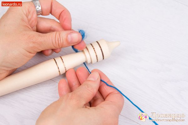 6. Когда нить приобретет достаточную длину, аккуратно снимем ее с кончика веретена, не давая раскрутиться, и завяжем внизу. Начало нити готово, а также закреплено снизу веретена.