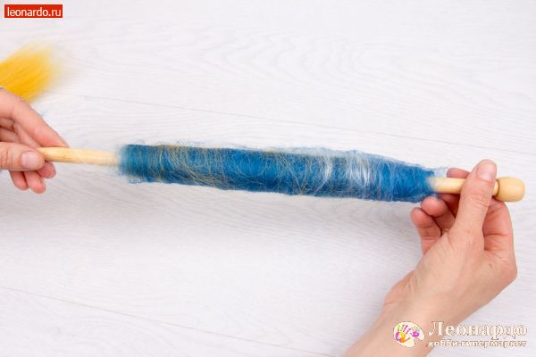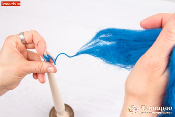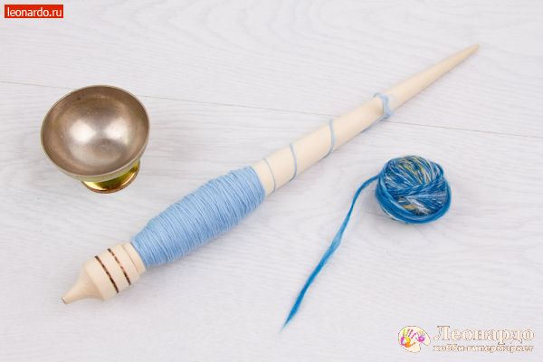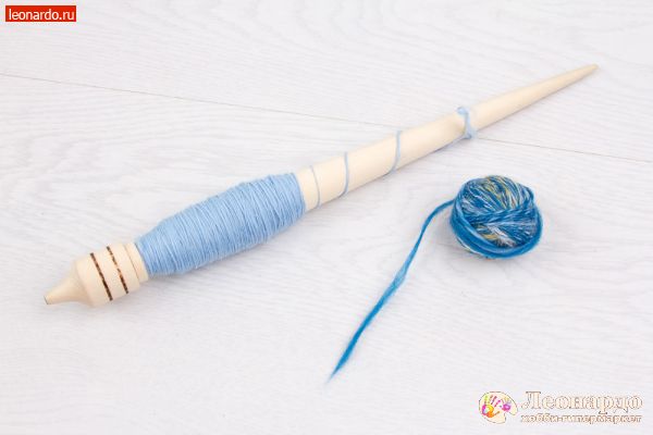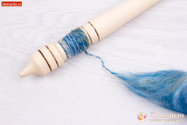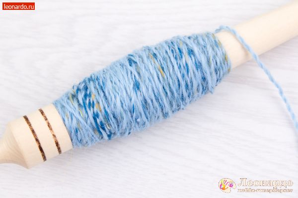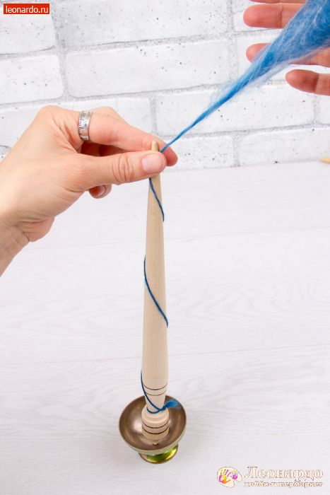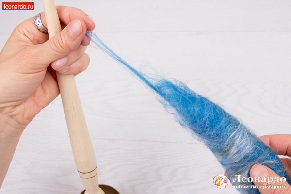 26. Спрядем вторую нить из шерсти голубого цвета. Важно: во время работы нужно вращать веретено в то жу сторону, что и при прядении первой нити.