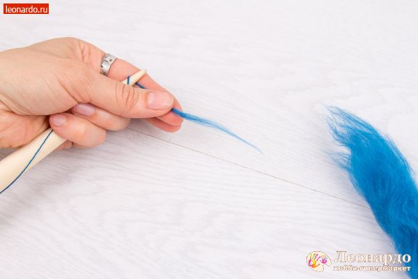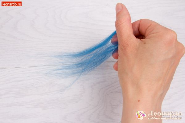 2. Возьмем в руку шерсть и слегка распушим конец. Другой рукой вытянем небольшую прядку. Прядь должна вытягиваться свободно. Если придется прикладывать усилия, возьмем шерсть подальше от конца.