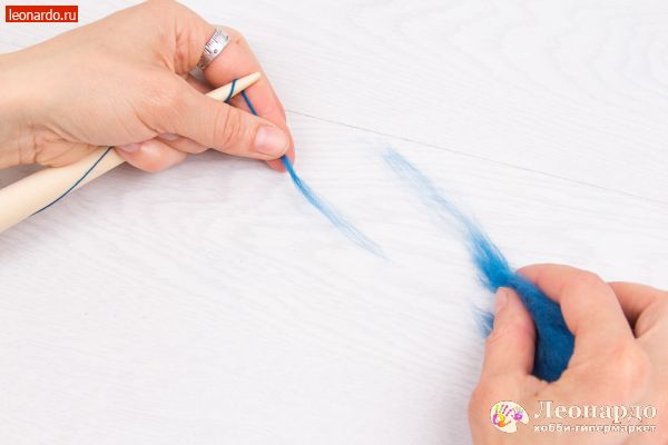 23. Если нить закончится, или оборвется шерсть, слегка распушим кончик спряденной нити и вытянем из шерсти небольшую прядь.