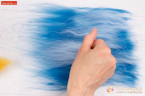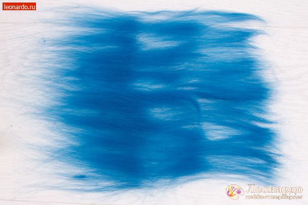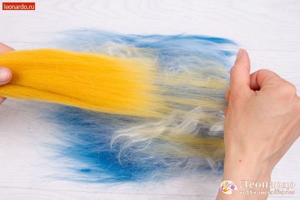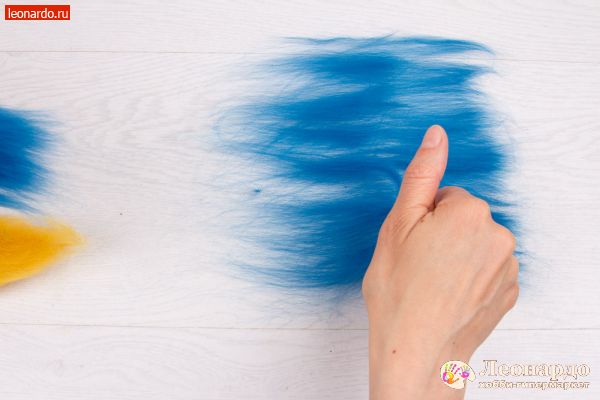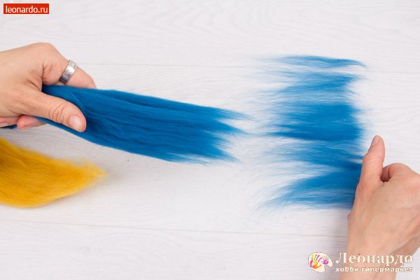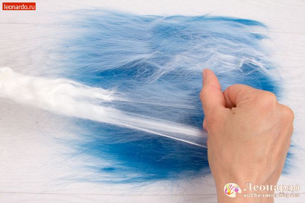 6. Точно так же поступим с волокном вискозы. Слегка распушим конец вискозной ленты и вытянем небольшие пряди. Выложим на шерсть. Процентное содержание волокна вискозы относительно шерсти – любое.