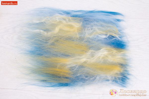 5. Выложим следующий ряд. Продолжим вытягивать прядки шерсти, выкладывая их с небольшим нахлестом на первый ряд. При желании можно менять цвета, а также их последовательность. Это повлияет их дальнейшее распределение в готовой нити.