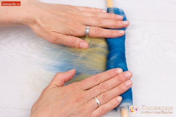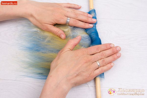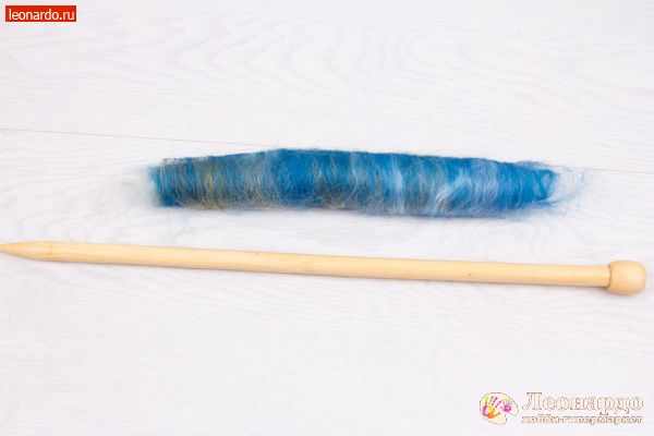 8. Теперь возьмем спицу «Gamma», арт.: BL2 и положим её на край шерсти поперек волокон (перпенидкулярно направлению волокон). Начнем скручивать «матрасик» вокруг спицы ладонями – не слишком туго, но и не слишком свободно.