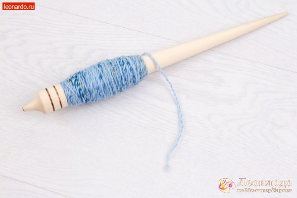 16. Когда нить станет достаточно длинной, аккуратно снимем ее с кончика веретена, не давая раскрутиться. Завяжем снизу веретена.