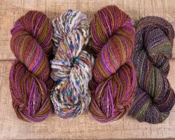 Примеры дизайнерской пряжи, изготовленной с помощью ручного веретена.