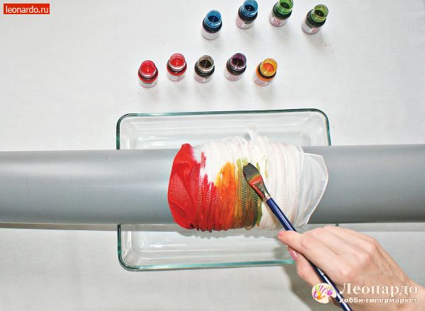 5. Приступаем к росписи. Кистью Kinotti (арт. 10212, №6, белка, плоская) поочередно наносим краски Love2art(арт. SIP-30) на ткань. Эти краски на водной основе, хорошо смешиваются между собой, не меняют структуру ткани и не утяжеляют ее. Если нужны яркие цвета, то краску берем из баночки. Для получения пастельных оттенков краску перед нанесением разбавляем водой. При росписи трубу поворачиваем вокруг своей оси, чтобы краска равномернее проникала в шелк.