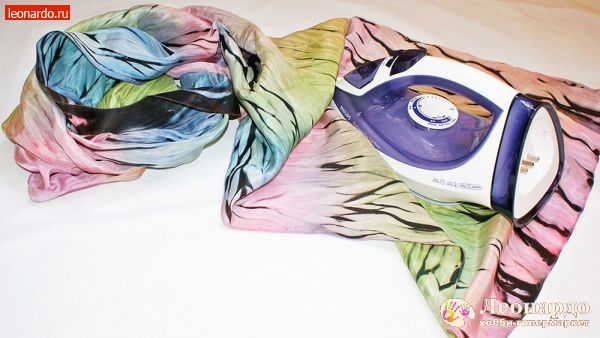 8. Приступаем к закреплению красок. Проглаживаем утюгом с изнаночной стороны, 2–3 минуты в режиме «хлопок», распрямляя складки каждого участка шелка.