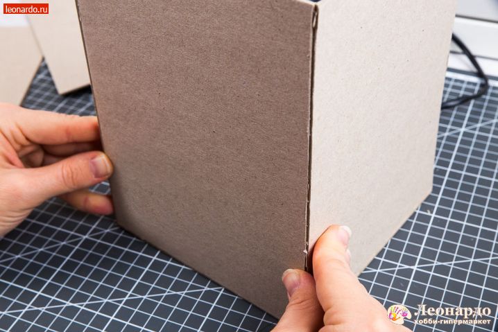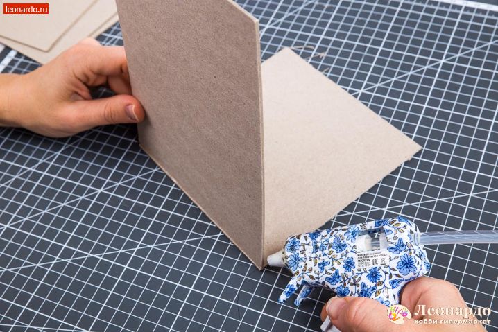 2. Чтобы собрать основу ящика, на квадратную картонную деталь (15х15 см) с помощью клеевого пистолета Micron, арт. DGL поочередно приклеиваем большие прямоугольники (15х21 см). Располагаем их торцом вниз с противоположных сторон квадрата. Смазывать клеем из пистолета лучше торцы прямоугольников. Держим заготовки крепко и ровно до тех пор, пока клей не застынет.
