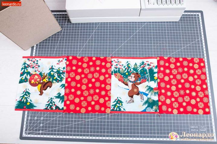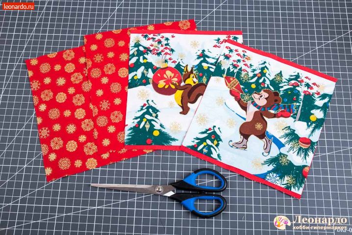 4. Из тканей с новогодним рисунком PEPPY, коллекция НОВОГОДНИЕ ЧУДЕСА вырезаем детали размером 16,5х18 см. Высота деталей будет равняться высоте купонов с картинками.