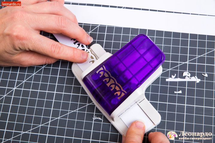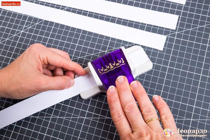 8. Из белой скрап-бумаги Mr.Painter, арт.: PST вырезаем полоски шириной 2.5-3 см. При помощи дырокола для декора края Mr. Painter, арт. BPL-45 (04 «Бублики») обрабатываем каждую полоску с одной стороны.