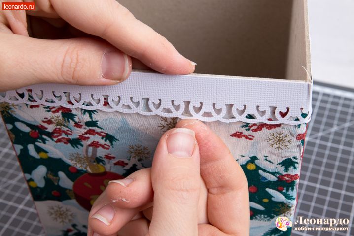 9. Приклеиваем полоски по краю ящика ажурной стороной вниз. Сначала по нижней стороне, затем по верхней.