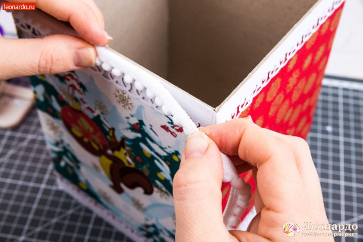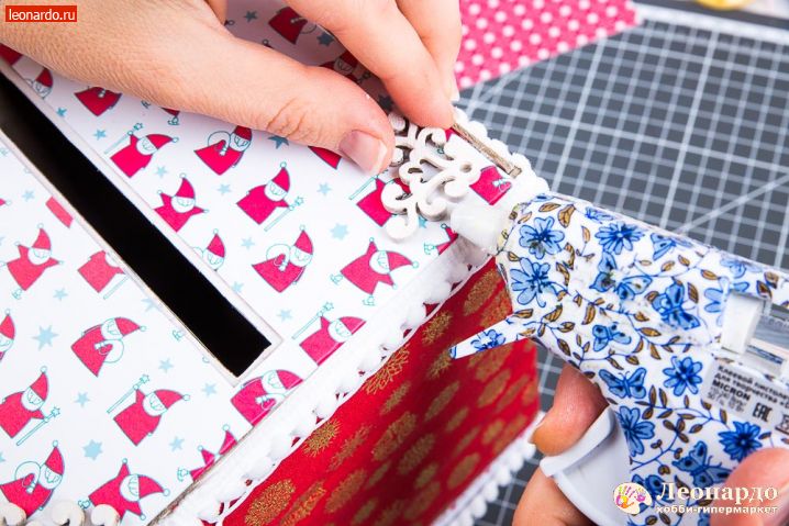 18. По углам крышки с помощью клеевого пистолета приклеиваем декоративные элементы.