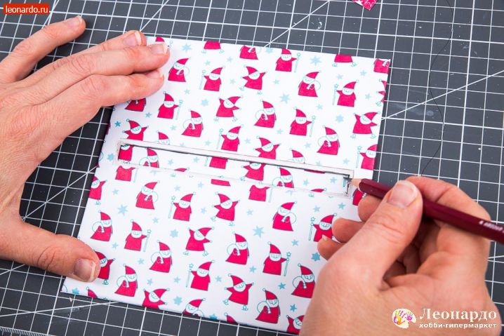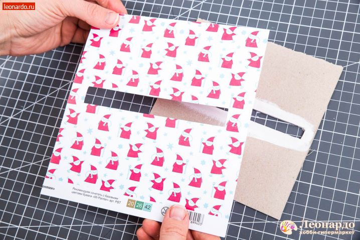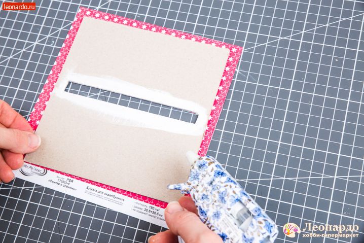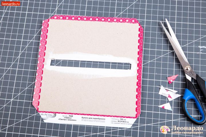 16. Для внутренней стороны крышки вырезаем из скрап-бумаги деталь размером 14,5х14,5 см. Отмечаем по центру контуры отверстия и вырезаем его с припуском 2 мм. Приклеиваем заготовку на картон.