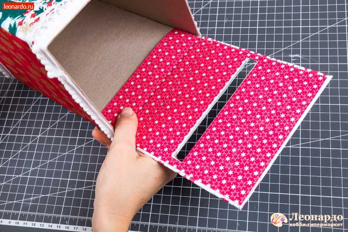 17. Крепим крышку к ящику с помощью полоски скрап-бумаги размером 14х8 см. Одним краем приклеиваем полосу к внутренней стороне крышки, другим вклеиваем внутрь ящика, как показано на фото.