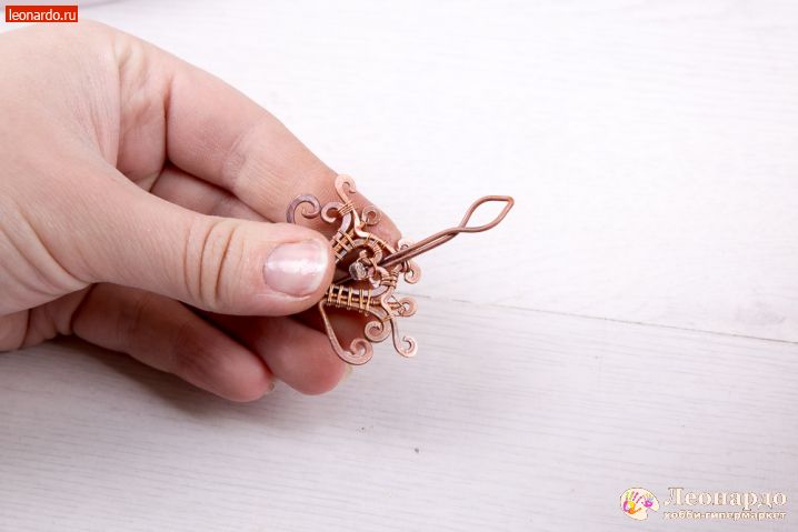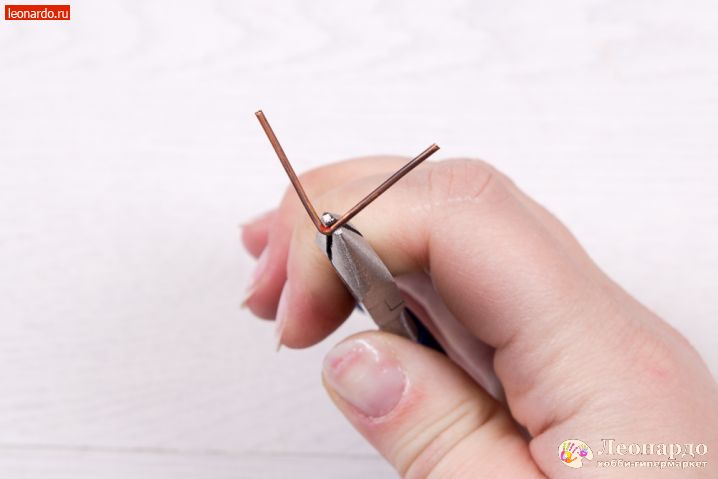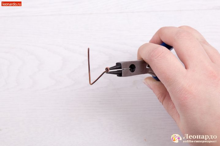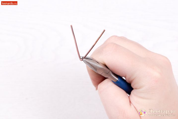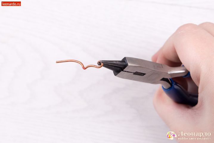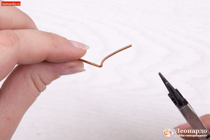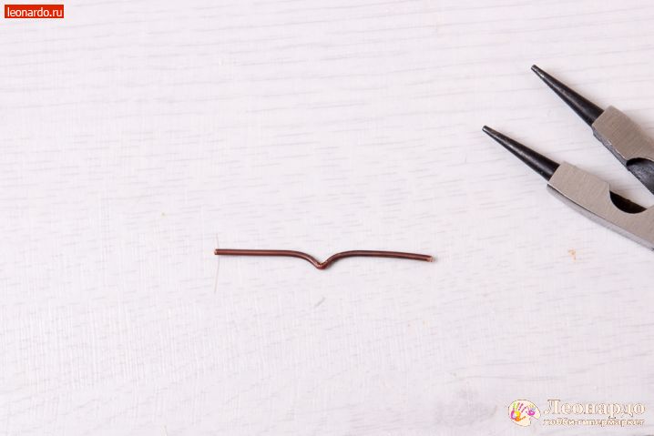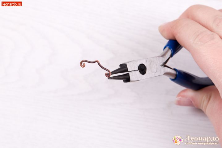 26. Сгибаем отрезки пополам и загибаем хвостики плоскими тонкогубцами Micron, стараясь не гнуть уголок, так, чтобы получилась капля. Для этого используем плоскогубцы, которыми мы держим проволоку WW-art около уголка, и пальцами тянем проволоку в нужную нам сторону. Плавный изгиб образуется сам, нужно лишь регулировать направление, в котором тянем конец проволоки.