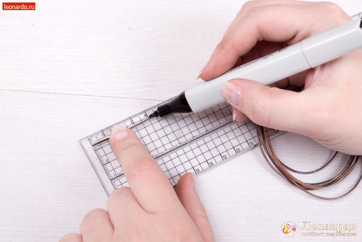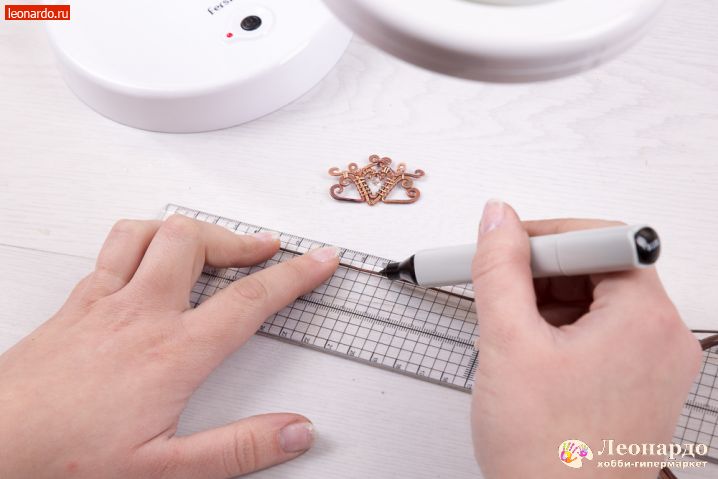 25. Приступаем к выполнению верхних лучиков снежинки. От проволоки WW-art толщиной 0,8 мм откусываем кусачками для изготовления бижутерии Micron 6 отрезков по 10 сантиметров. Для разметки используем универсальную линейку GAMMA и маркер VISTA-ARTISTA.