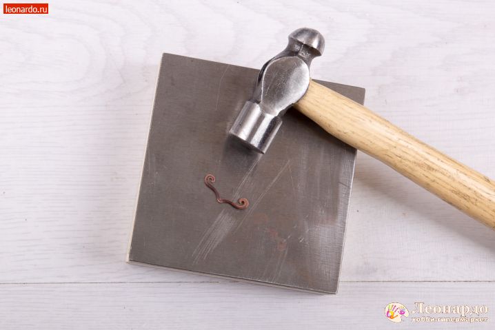 10. Выполним еще 5 аналогичных заготовок. Отбиваем завитки и центральный уголок молотком для чеканки ELVAS на металлическом блоке ELVAS.