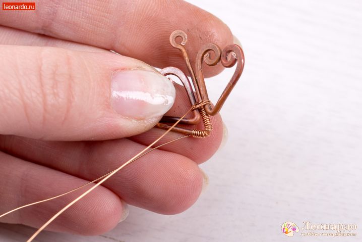 17. К правому лучу элемента начинаем приматывать сразу два элемента «сердечка». Для этого придерживая их, проводим тонкой проволокой WW-art вокруг них два оборота, а затем снова начинаем обматывать элемент между ними.