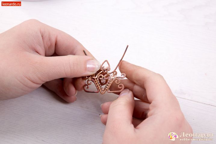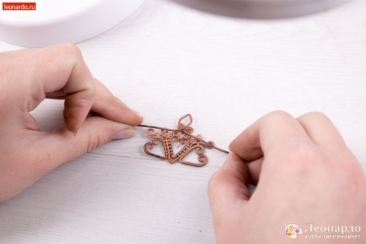 19. Элемент в форме скобки закрепляем над сердечками. Пропускаем проволоку WW-art через колечко и закрепляем скобку с другой стороны.