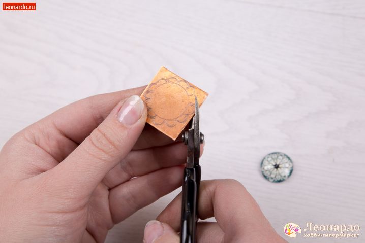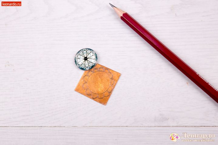 33. Контуры кабошона Zlatka (арт. JCR-02, №06 черно-белый мотив) обводим на металлическом листе для чеканки ELVAS (арт. MLH-02, под медь) и рисуем лепестки "ромашки" вокруг чёрнографитовым карандашом STILSY (арт. 1161SB HB).