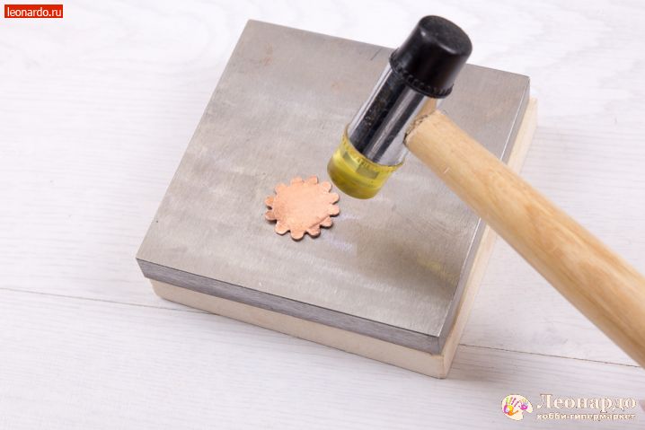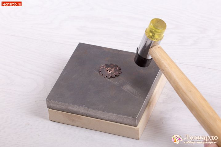 35. В процессе вырезания края металла загибаются, поэтому выравниваем заготовку молотком для ювелирных работ с двумя сменными резиновыми бойками ELVAS (арт. MSH-02) на металлическом блоке ELVAS.
