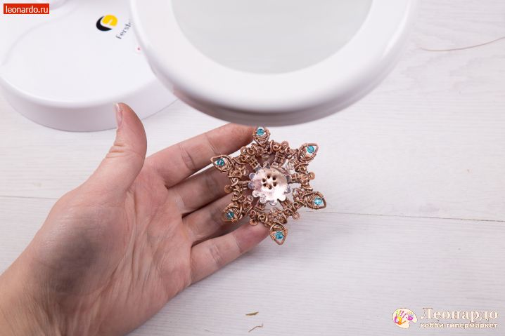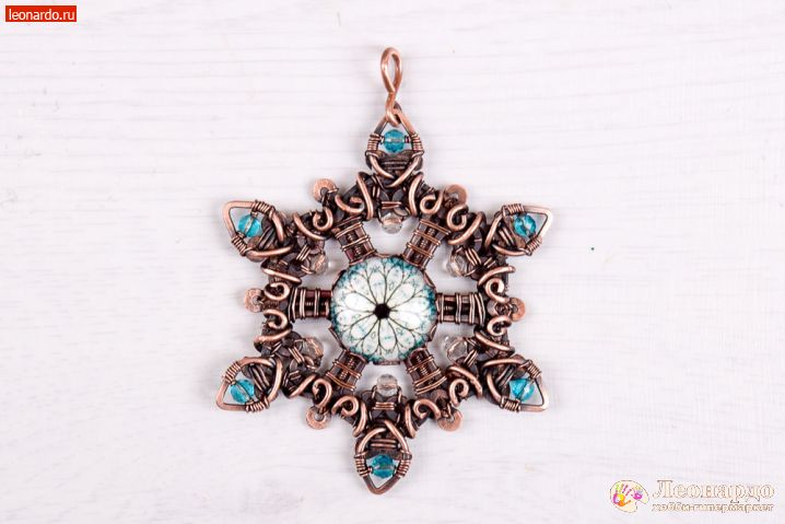 Нарядите свою ёлочку как настоящую принцессу. Используя технику плетения из проволоки WW-art, изготовьте необычную снежинку, которая будет выглядеть, как настоящее ювелирное изделие, сделанное профессионалом. В центре поместите маленькую «льдинку» – кабошон Zlatka. Украсьте стеклянными бусинами Zlatka лучи, они будут искриться на свету. В итоге получится необычное ёлочное украшение. Удивите своих гостей изысканными, утонченными деталями новогоднего оформления дома!
